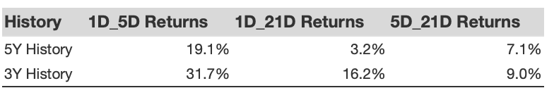 Additional data for observed 5-Day (5D), and 21-Day (21D) returns post earnings are summarized along with the statistics in the table below.