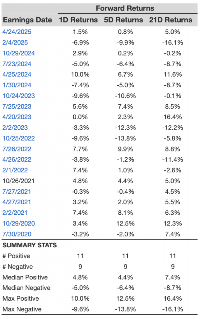 - There are 20 earnings data points recorded over the last five years, with 11 positive and 9 negative one-day (1D) returns observed. In summary, positive 1D returns were seen about 55% of the time.