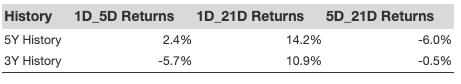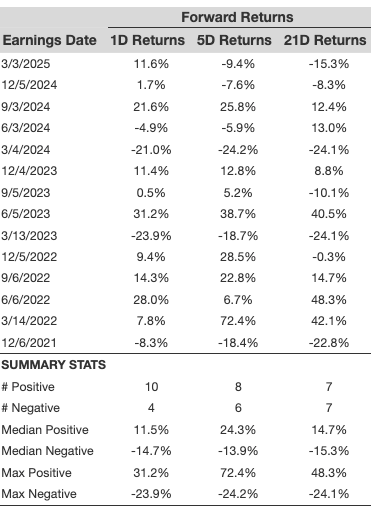 - There are 14 earnings data points recorded over the last five years, with 10 positive and 4 negative one-day (1D) returns observed. In summary, positive 1D returns were seen about 71% of the time.