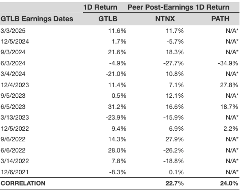 Sometimes, peer performance can have an influence on post-earnings stock reaction. In fact, the pricing-in might begin before the earnings are announced. Here is some historical data on the past post-earnings performance of GitLab stock compared with the stock performance of peers that reported earnings just before GitLab. For fair comparison, peer stock returns also represent post-earnings one-day (1D) returns.