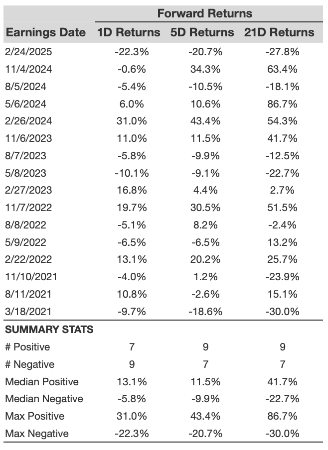 - There are 16 earnings data points recorded over the last five years, with 7 positive and 9 negative one-day (1D) returns observed. In summary, positive 1D returns were seen about 44% of the time.