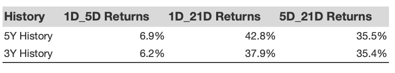 Additional data for observed 5-Day (5D), and 21-Day (21D) returns post earnings are summarized along with the statistics in the table below.