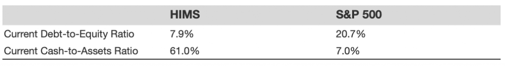 - HIMS Debt was $1.0 Bil at the end of the most recent quarter, while its current Market Cap is $13 Bil. This implies Debt-to-Equity Ratio of 7.9%