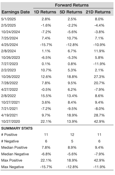 - There are 17 earnings data points recorded over the last five years, with 11 positive and 6 negative one-day (1D) returns observed. In summary, positive 1D returns were seen about 65% of the time.