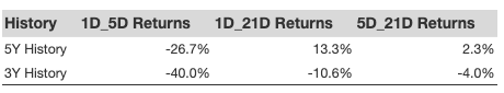 Additional data for observed 5-Day (5D), and 21-Day (21D) returns post earnings are summarized along with the statistics in the table below.