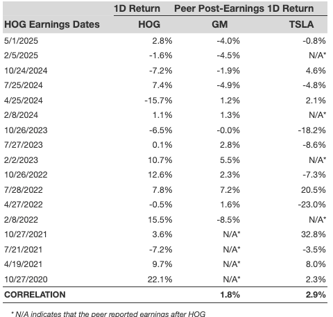 Sometimes, peer performance can have influence on post-earnings stock reaction. In fact, the pricing-in might begin before the earnings are announced. Here is some historical data on the past post-earnings performance of Harley-Davidson stock compared with the stock performance of peers that reported earnings just before Harley-Davidson. For fair comparison, peer stock returns also represent post-earnings one-day (1D) returns.