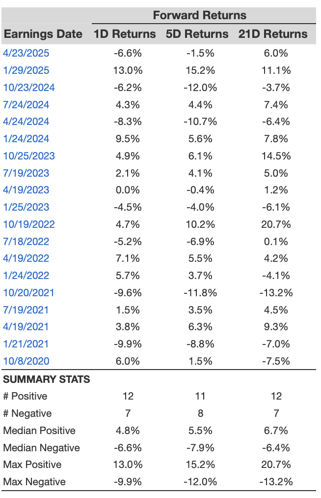 - There are 19 earnings data points recorded over the last five years, with 12 positive and 7 negative one-day (1D) returns observed. In summary, positive 1D returns were seen about 63% of the time.