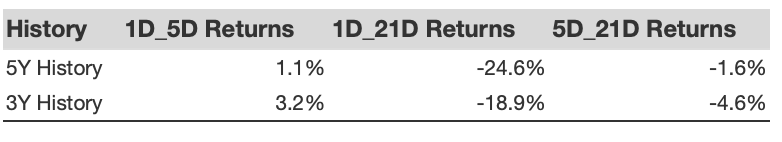 Additional data for observed 5-Day (5D), and 21-Day (21D) returns post earnings are summarized along with the statistics in the table below.