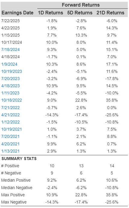- There are 19 earnings data points recorded over the last five years, with 10 positive and 9 negative one-day (1D) returns observed. In summary, positive 1D returns were seen about 53% of the time.