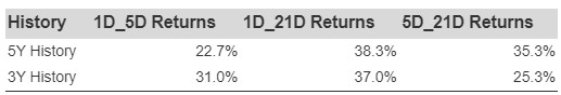 Additional data for observed 5-Day (5D) and 21-Day (21D) returns post earnings are summarized along with the statistics in the table below.