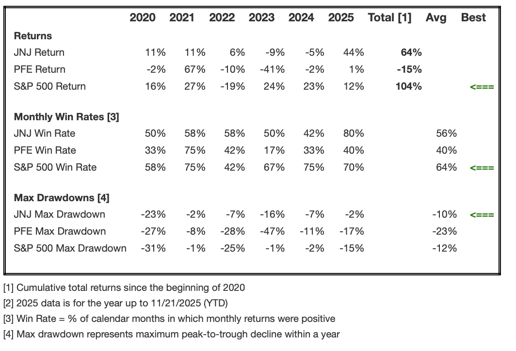 See detailed fundamentals on Buy or Sell PFE Stock and Buy or Sell JNJ Stock. Below, we compare market return and related metrics across years.