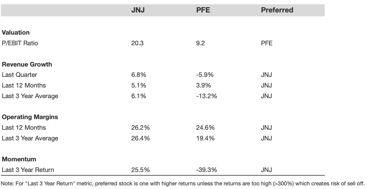 These differences become even clearer when you look at the financials side by side. The table highlights how JNJ’s fundamentals stack up against those of PFE on growth, margins, momentum, and valuation multiples.