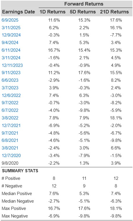 - There are 20 earnings data points recorded over the last five years, with 12 positive and 8 negative one-day (1D) returns observed. In summary, positive 1D returns were seen about 60% of the time.