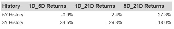 Additional data for observed 5-Day (5D) and 21-Day (21D) returns post earnings are summarized along with the statistics in the table below.
