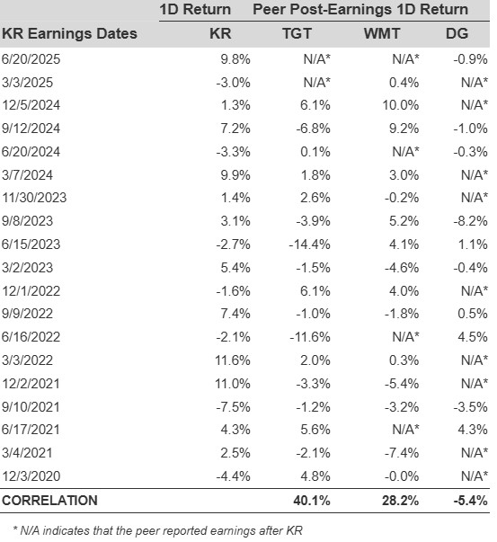 Sometimes, peer performance can have influence on post-earnings stock reaction. In fact, the pricing-in might begin before the earnings are announced. Here is some historical data on the past post-earnings performance of Kroger stock compared with the stock performance of peers that reported earnings just before Kroger. For fair comparison, peer stock returns also represent post-earnings one-day (1D) returns.