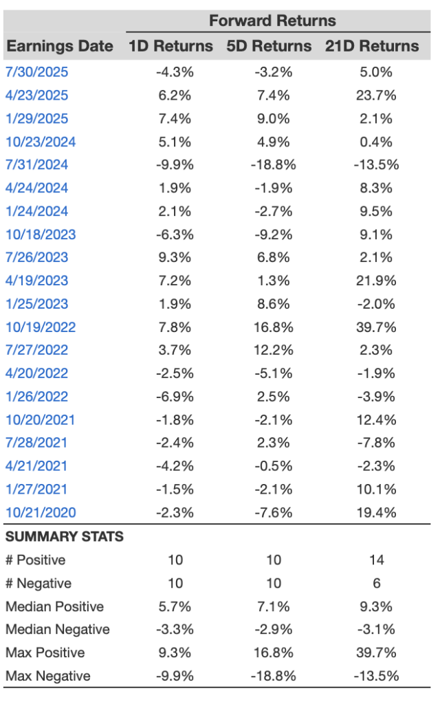 - There are 20 earnings data points recorded over the last five years, with 10 positive and 10 negative one-day (1D) returns observed. In summary, positive 1D returns were seen about 50% of the time.