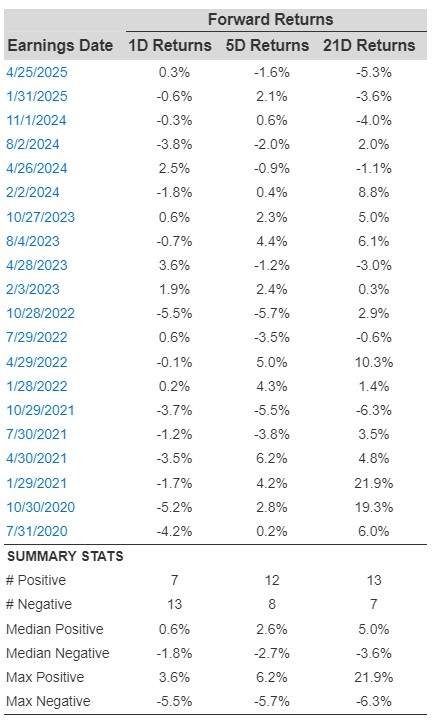 - There are 20 earnings data points recorded over the last five years, with 7 positive and 13 negative one-day (1D) returns observed. In summary, positive 1D returns were seen about 35% of the time.