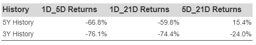 Additional data for observed 5-Day (5D), and 21-Day (21D) returns post earnings are summarized along with the statistics in the table below.