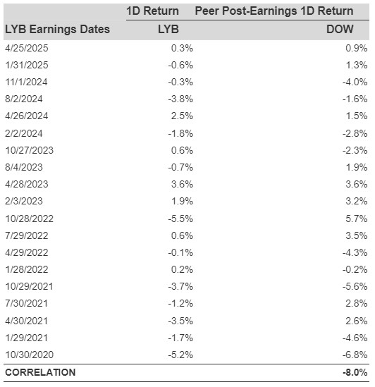Sometimes, peer performance can have influence on post-earnings stock reaction. In fact, the pricing-in might begin before the earnings are announced. Here is some historical data on the past post-earnings performance of LyondellBasell Industries stock compared with the stock performance of peers that reported earnings just before LyondellBasell Industries. For fair comparison, peer stock returns also represent post-earnings one-day (1D) returns.