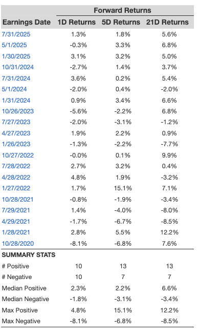 The company has $500 Bil in current market capitalization. Revenue over the last twelve months was $30 billion, and it was operationally profitable, with $18 billion in operating profits and net income of $14 billion. While a lot will depend on how results stack up against consensus and expectations, understanding historical patterns might just turn the odds in your favor if you are an event-driven trader.
