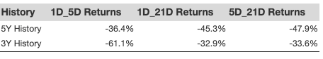 Additional data for observed 5-Day (5D) and 21-Day (21D) returns post earnings are summarized along with the statistics in the table below.