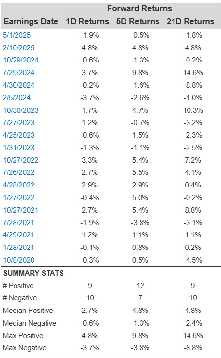 - There are 19 earnings data points recorded over the last five years, with 9 positive and 10 negative one-day (1D) returns observed. In summary, positive 1D returns were seen about 47% of the time.
