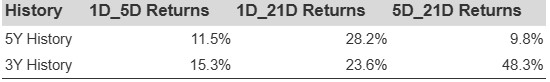 Additional data for observed 5-Day (5D) and 21-Day (21D) returns post earnings are summarized along with the statistics in the table below.