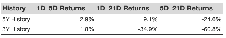 Additional data for observed 5-Day (5D), and 21-Day (21D) returns post earnings are summarized along with the statistics in the table below.