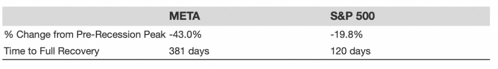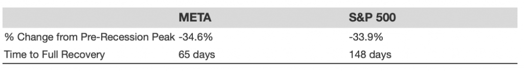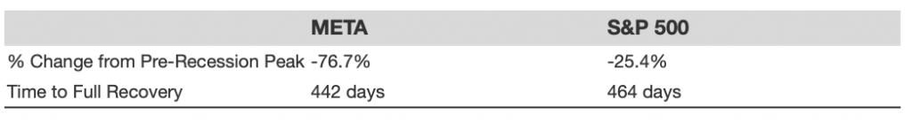 - META stock fell 43.0% from a high of $217.50 on 25 July 2018 to $124.06 on 24 December 2018 vs. a peak-to-trough decline of 19.8% for the S&P 500.