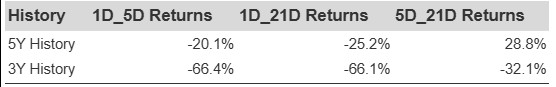 - There are 20 earnings data points recorded over the last five years, with 6 positive and 14 negative one-day (1D) returns observed. In summary, positive 1D returns were seen about 30% of the time.