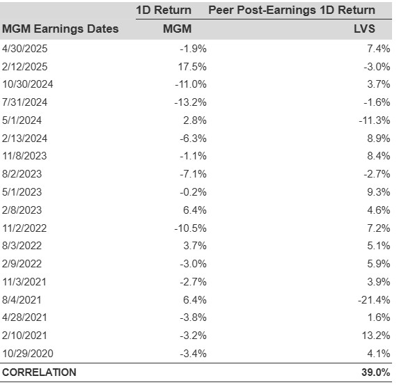 Sometimes, peer performance can have influence on post-earnings stock reaction. In fact, the pricing-in might begin before the earnings are announced. Here is some historical data on the past post-earnings performance of MGM Resorts International stock compared with the stock performance of peers that reported earnings just before MGM Resorts International. For fair comparison, peer stock returns also represent post-earnings one-day (1D) returns.