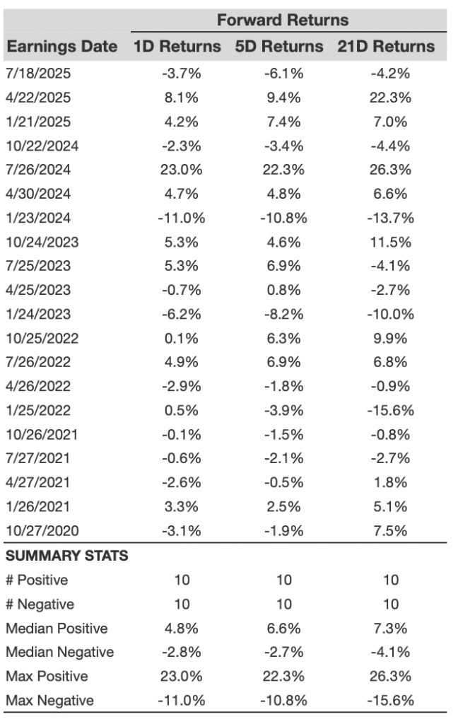 - There are 20 earnings data points recorded over the last five years, with 10 positive and 10 negative one-day (1D) returns observed. In summary, positive 1D returns were seen about 50% of the time.