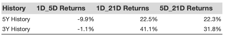 Additional data for observed 5-Day (5D), and 21-Day (21D) returns post earnings are summarized along with the statistics in the table below.