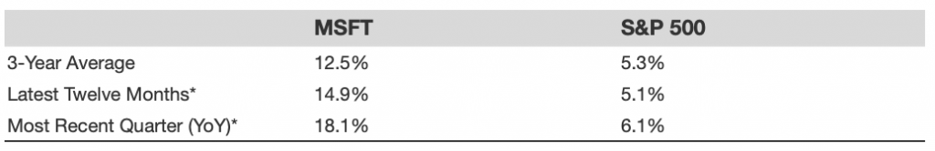- Microsoft has seen its top line grow at an average rate of 12.5% over the last 3 years