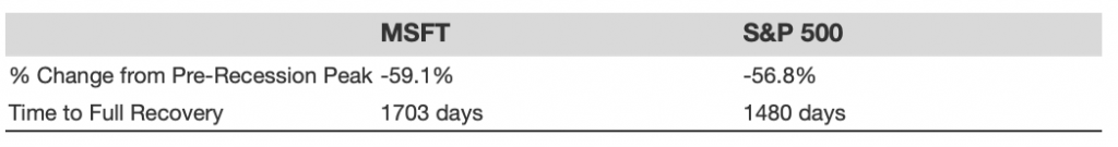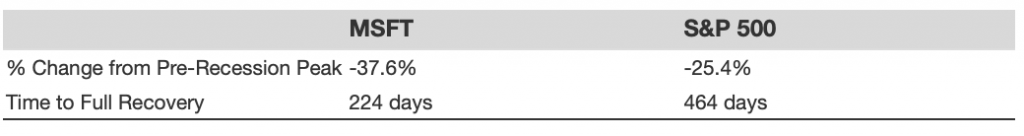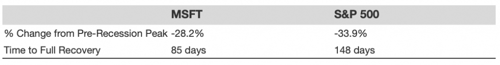 MSFT saw an impact slightly better than the S&P 500 index during various economic downturns. We assess this based on both (a) how much the stock fell and, (b) how quickly it recovered.