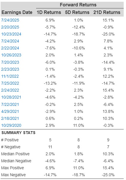 The company has $104 Bil in current market capitalization. Revenue over the last twelve months was $21 Bil, and it was operationally profitable with $8.0 Bil in operating profits and net income of $6.3 Bil. While a lot will depend on how results stack up against consensus and expectations, understanding historical patterns might just turn the odds in your favor if you are an event-driven trader.