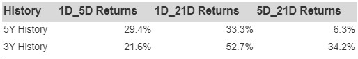 Additional data for observed 5-Day (5D) and 21-Day (21D) returns post earnings are summarized along with the statistics in the table.