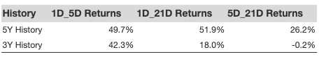 Additional data for observed 5-Day (5D) and 21-Day (21D) returns post earnings are summarized along with the statistics in the table below.