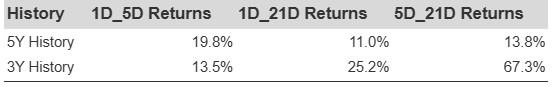 Additional data for observed 5-Day (5D), and 21-Day (21D) returns post earnings are summarized along with the statistics in the table below.