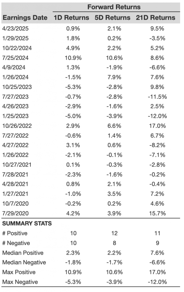 - There are 20 earnings data points recorded over the last five years, with 10 positive and 10 negative one-day (1D) returns observed. In summary, positive 1D returns were seen about 50% of the time.