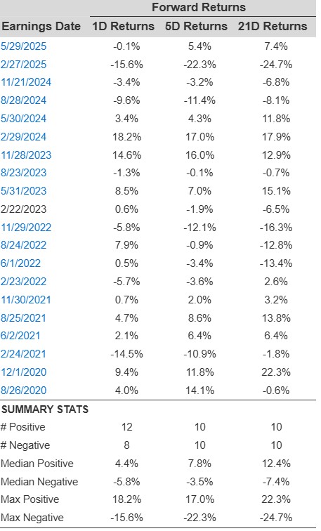 - There are 20 earnings data points recorded over the last five years, with 12 positive and 8 negative one-day (1D) returns observed. In summary, positive 1D returns were seen about 60% of the time.