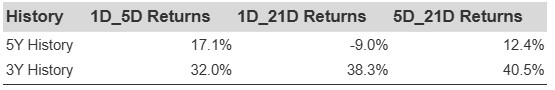 Additional data for observed 5-Day (5D) and 21-Day (21D) returns post earnings are summarized along with the statistics in the table below.