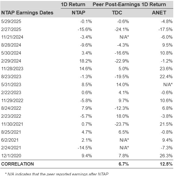 Sometimes, peer performance can have influence on post-earnings stock reaction. In fact, the pricing-in might begin before the earnings are announced. Here is some historical data on the past post-earnings performance of NetApp stock compared with the stock performance of peers that reported earnings just before NetApp. For fair comparison, peer stock returns also represent post-earnings one-day (1D) returns.