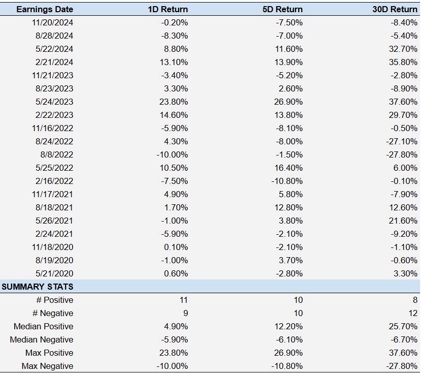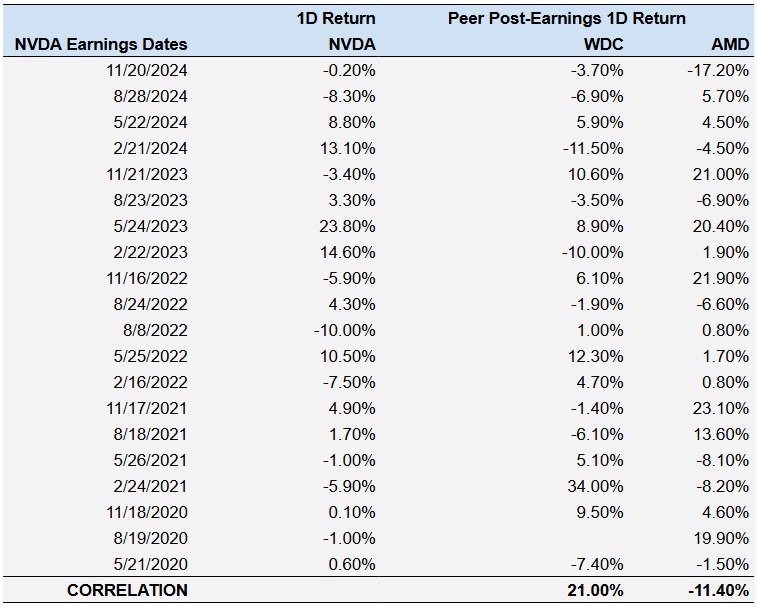 Sometimes, peer performance can have influence on post-earnings stock-reaction. In fact, the pricing-in might begin before the earnings are announced. Here is some historical data on past post-earnings performance of NVIDIA stock compared with stock performance of peers that reported earnings just prior to NVIDIA. For fair comparison, peer stock returns also represent post-earnings one day (1D) return.