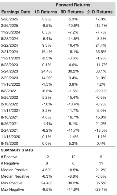 - There are 20 earnings data points recorded over the last five years, with 12 positive and 8 negative one-day (1D) returns observed. In summary, positive 1D returns were seen about 60% of the time.