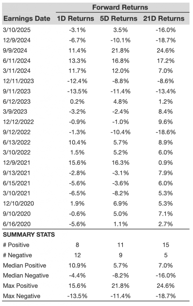 - There are 20 earnings data points recorded over the last five years, with 8 positive and 12 negative one-day (1D) returns observed. In summary, positive 1D returns were seen about 40% of the time.