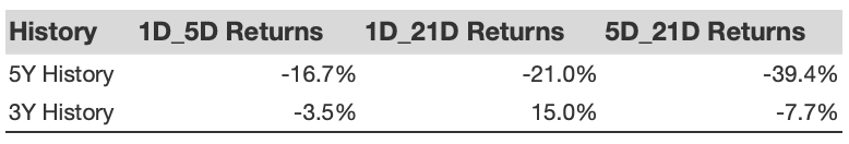 Additional data for observed 5-Day (5D), and 21-Day (21D) returns post earnings are summarized along with the statistics in the table below.