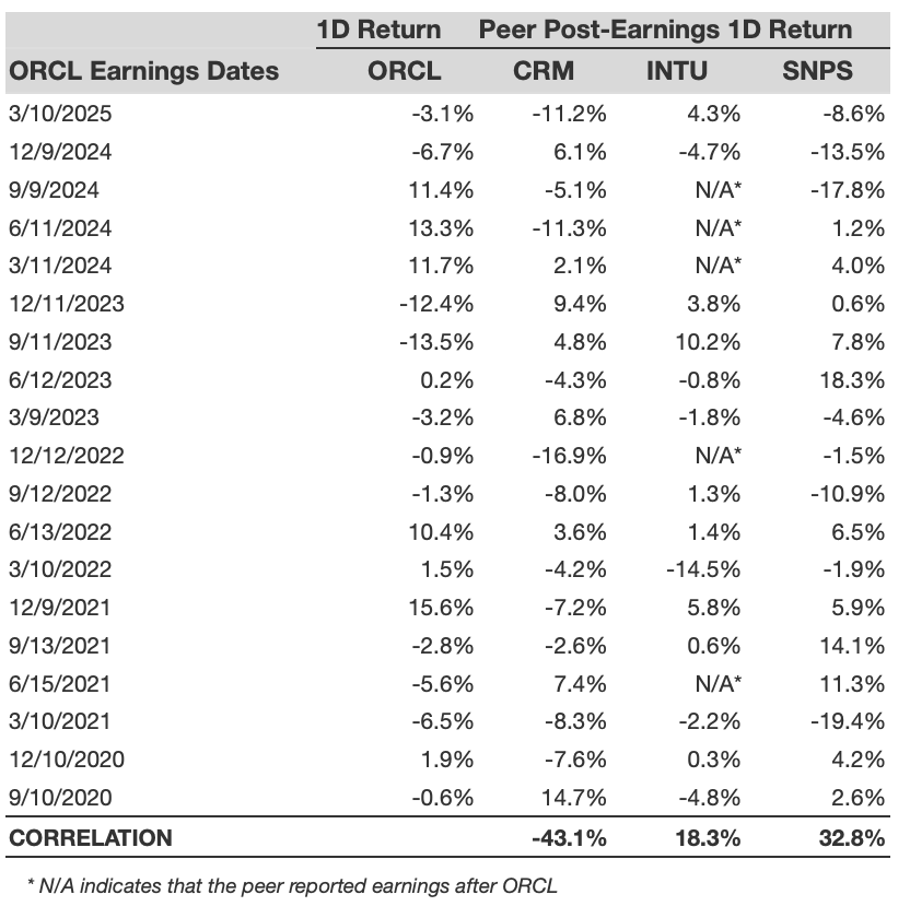 Sometimes, peer performance can have influence on post-earnings stock reaction. In fact, the pricing-in might begin before the earnings are announced. Here is some historical data on the past post-earnings performance of Oracle stock compared with the stock performance of peers that reported earnings just before Oracle. For fair comparison, peer stock returns also represent post-earnings one-day (1D) returns.