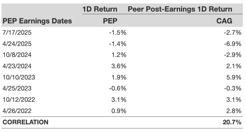 Sometimes, peer performance can have an influence on post-earnings stock reaction. In fact, the pricing-in might begin before the earnings are announced. Here is some historical data on the past post-earnings performance of PepsiCo stock compared with the stock performance of peers that reported earnings just before PepsiCo. For fair comparison, peer stock returns also represent post-earnings one-day (1D) returns.
