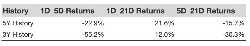 Additional data for observed 5-Day (5D) and 21-Day (21D) returns post earnings are summarized along with the statistics in the table below.